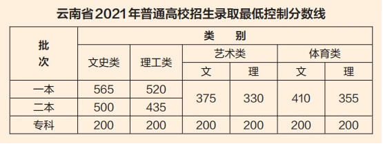 6月23日,经省招生考试委员会审定,2021年云南省普通高校招生考试录取最低控制分数线划定并公布。