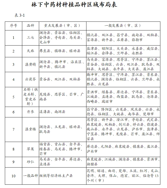 依托云南中药材种质资源优势、自然条件优势,聚焦“十大云药”,优选适合林下种植、历史悠久、特色鲜明、品质优良、在国内外市场优势突出、产业前景广阔的中药材品种重点发展,适当发展一般品种,突出小而精、小而优、小而特。坚持高点定位,突出特色,品质优先,着力打造“云药”高端品牌,引领云药产业发展。