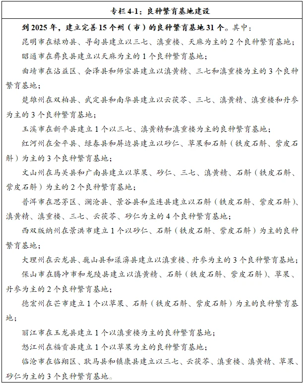 开展林下中药材良种定向选育研究,将现代生物技术和常规育种方法相结合,以三七、天麻、滇黄精、云茯苓、石斛(铁皮石斛、紫皮石斛)、滇重楼等道地药材和特色药材为重点,定向选育优质、高效、抗逆性强、抗病虫害的中药材新品种,开展适合林下种植良种的选育研究和应用,力争在良种选育和新品种培育等方面取得突破。积极推进林下中药材良种的审(认)定和推广工作。