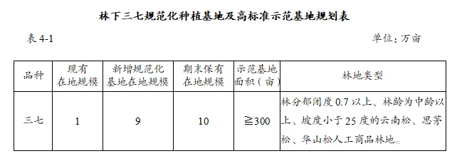 期末达到林下三七规范化种植基地在地规模10万亩。以重点县(市、区)为主,兼顾一般县(市、区),选择适宜的林地类型新增建立三七规范化种植基地在地规模9万亩。其中在重点县(市、区)选择基础条件最佳的发展区域建立1个规模不低于300亩的高标准种植示范基地。
