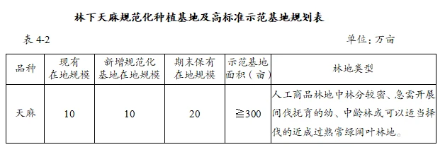期末达到林下天麻规范化种植基地在地规模20万亩。以重点县(市、区)为主,兼顾一般县(市、区),选择适宜的林地类型新增建立天麻规范化种植基地在地规模10万亩,其中在重点县(市、区)选择基础条件最佳的发展区域建立1个规模不低于300亩的高标准种植示范基地。