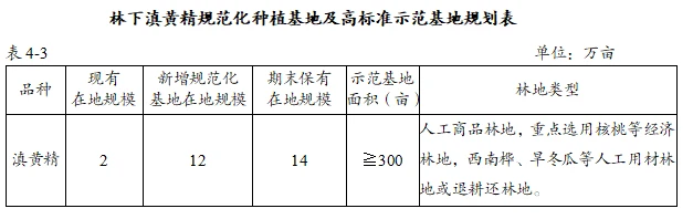 期末达到林下滇黄精规范化种植基地在地规模14万亩。以重点县(市、区)为主,兼顾一般县(市、区),重点选用核桃、西南桦、旱冬瓜等人工商品林地新增建立滇黄精规范化种植基地在地规模12万亩。在重点县(市、区)选择基础条件最佳的发展区域建立1个规模不低于300亩的高标准种植示范基地。
