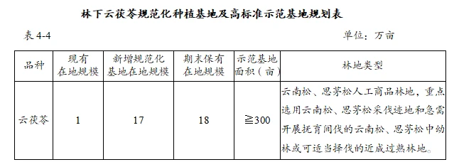 期末达到林下云茯苓规范化种植基地在地规模18万亩。以重点县(市、区)为主,兼顾一般县(市、区),选用云南松、思茅松人工商品林地新增建立云茯苓规范化种植基地在地规模17万亩。林地抚育间伐后形成的伐桩以及主伐商品材的采伐段木和梢头小料均可作为菌材加以利用。在重点县(市、区)选择基础条件最佳的发展区域建立1个规模不低于300亩的高标准种植示范基地。