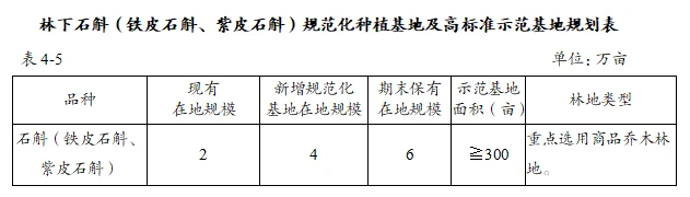 期末达到林下石斛(铁皮石斛、紫皮石斛)规范化种植基地在地规模6万亩。以重点县(市、区)为主,兼顾一般县(市、区),重点选用商品乔木林地,采用在树上捆绑的方式仿野生新增规范化种植基地在地规模4万亩。在重点县(市、区)选择基础条件最佳的发展区域建立1个规模不低于300亩的高标准种植示范基地。