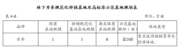 期末达到林下丹参规范化种植基地在地规模6万亩。以重点县(市、区)为主,兼顾一般县(市、区),重点选用核桃等乔木经济林地新增建立丹参规范化种植基地在地规模5万亩。在重点县(市、区)选择基础条件最佳的发展区域建立1个规模不低于300亩的高标准种植示范基。