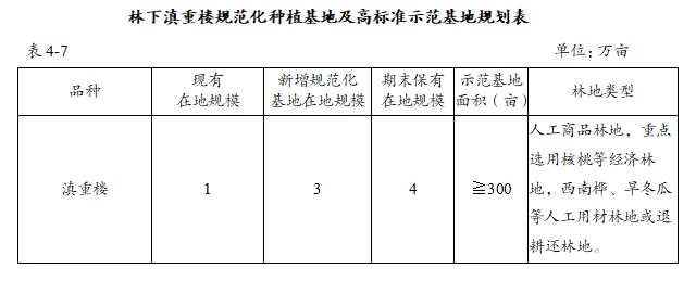 期末达到林下滇重楼规范化种植基地在地规模4万亩。以重点县(市、区)为主,兼顾一般县(市、区),重点选用核桃、西南桦、旱冬瓜等人工商品林地新增建立滇重楼规范化种植基地在地规模3万亩。在重点县(市、区)选择基础条件最佳的发展区域培育建立1个规模不低于300亩的高标准种植示范基地。