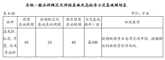 重点在核桃等经济林主产州(市)相关县(市、区),选择林地空间较开阔、植株比较稀疏的产前期或初产期核桃等经济林地,新增发展红花、半夏等其他一般品种20万亩,稳定滇龙胆等现有规模,期末一般品种在地总规模达到60万亩以上。在重点县(市、区)选择基础条件最佳的发展区域建立2个规模分别不低于300亩的高标准种植示范基地。