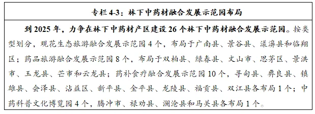 石斛(铁皮石斛、紫皮石斛)、丹参、滇重楼、白及、红花等种植基地,可依托药材植物优美的花形、花色和观赏价值,开发以观花为主的生态旅游融合发展示范园;借助重点产区相关旅游景区平台,建立药品旅游融合发展示范园,向游客提供林下中药材产品品鉴的机会,宣传品牌,扩大品牌知名度,促进林下中药材产区与旅游业的融合发展;三七、天麻、云茯苓、滇黄精、草果、砂仁等重点产区,结合森林康养,引驻国内知名餐饮企业开设药食药膳体验店,建立药补食疗融合发展示范园,根据《药食同源药膳标准通则》,开发菜谱、产品和炖汤中药包,促进林下中药材产区与餐饮服务业的融合发展;以林下中药材野生种质资源收集保存圃、良种繁育基地、示范种植基地、主要药材产地初加工基地为依托,建立以林下中药材植物资源图谱、中药科普、文化展示等为主题的林下中药材博览园,促进林下中药材产区与自然教育、科普宣传、文化推广的融合发展。