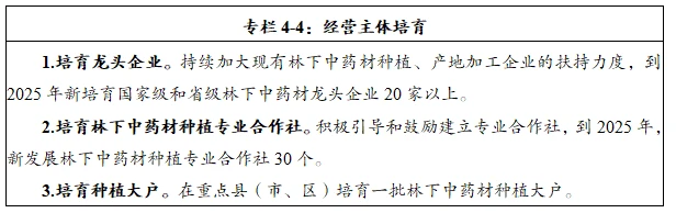 到2025年,实现林下中药材种植面积430万亩以上,其中新增规范化种植基地规模80万亩,绿色认证、有机认证基地规模逐年增加。林下中药材年产量50万吨以上,实现农业产值300亿元以上,农产品加工产值150亿元,批发零售与文旅服务产值200亿元,综合产值650亿元以上,林下中药材产值占全省中药材总产值的比重显著提高。新增培育林下中药材生产省级龙头企业20家以上,总数达到100家以上,力争培育一批国家级重点龙头企业。创建5~10个在全国有影响力的林下中药材品牌。