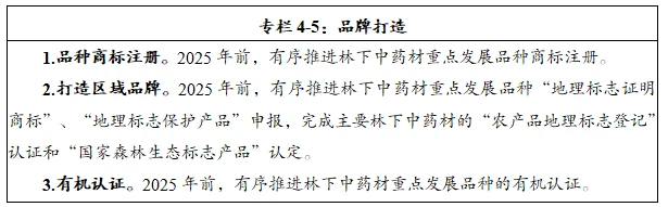 开展“三品一标”、国家森林生态标志产品认定,积极打造林下中药材区域公用品牌、企业品牌。实施大企业集团品牌发展战略,发挥大企业集团和行业龙头骨干企业在品牌创建中的主导作用,积极争创知名品牌。积极支持林下中药材特色品种、大品种、药食两用品种原产地、主产区、集散地申请“地理标志证明商标”“地理标志保护产品”“农产品地理标志登记”等,打造知名区域品牌;开展国家森林生态标志产品认定;积极开展基地和产品的有机认证,扩大有机中药材市场份额;发掘整理彝医药、傣医药、藏医药及云南其他特色少数民族医药文献,扶持民族药医院制剂开发与使用,培育一批民族药材品牌;强化品牌宣传,积极参与南博会、昆明农博会等重大展会推介,开展“云南林下中药材”品牌宣传,支持和鼓励龙头企业等品牌创建主体举办形式多样的品牌推广活动,参与“绿色食品牌”“十大名药材”评选,全方位、多层次地打造“云南林下中药材”这张名片。