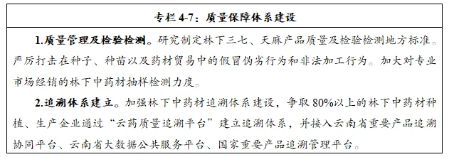 严格实施《中药材生产质量管理规范》和《药品经营质量管理规范》,提升林下中药材生产质量管理水平。构建林下中药材全程质量管理体系,完善种子种苗、投入品管理、档案记录、产品检测、合格证准出等制度。研究制定林下三七、天麻、滇黄精等中药材产品质量地方标准,探索制定林下中药材质量管理规范激励政策,鼓励林下中药材种植企业生产林下中药材精品。严厉打击在种子、种苗以及药材贸易中的假冒伪劣行为和非法加工行为,鼓励中药生产企业使用源头明确的优质林下中药材原料。推进企业诚信体系建设,加大失信联合惩戒力度。