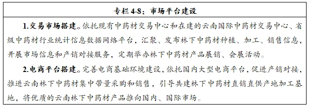 依托昆明市菊花园中药材交易市场、文山三七国际交易中心、小草坝天麻国际交易中心等3个现有中药材交易市场,在建的云南国际中药材交易中心,以及其他中药材交易市场,开展林下中药材产品线下线上销售。结合省级中药材行业统计信息数据网络平台,完善林下中药材市场信息服务平台建设,开展全省林下中药材种植、产地加工、销售信息数据收集和发布,通过互联网对接国内各大中药材交易市场供求信息,建立预警机制,引导经营主体及时调控林下中药材生产规模,避免盲目发展造成经营损失。支持和鼓励各级政府部门、行业协会和企业联盟举办林下中药材产品展销、会展活动。