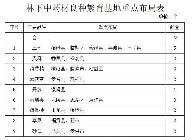 积极开展三七、天麻、滇黄精、石斛(铁皮石斛和紫皮石斛,下同)、云茯苓、丹参、滇重楼、草果、砂仁等林下中药材良种审(认)定工作,加速良种化进程。鼓励有关大学和科研单位、经营主体开展林下中药材良种选育,开展新品种研发和快速繁育技术研究,提高基地建设良种使用率和科技贡献率。