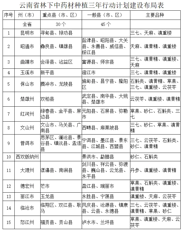 以三七、天麻、滇黄精、石斛、滇重楼、草果、砂仁等7个品种为重点,选择在部分重点县开展林下中药材种植综合示范基地建设,示范基地集中连片面积不低于300亩。示范基地建设严格执行林下种植(提质增效)技术规程,突出高标准,以指导各单品品种积极稳妥、科学有序推进规范化、标准化种植,并积极向国家和省申报示范基地。到2023年,建成10个综合种植示范基地。(澳门威尼斯人APP牵头,省发展改革委、省财政厅、省科技厅、省农业农村厅、省水利厅、省乡村振兴局等部门,有关大学和科研院所,各州、市人民政府按照职责分工负责)