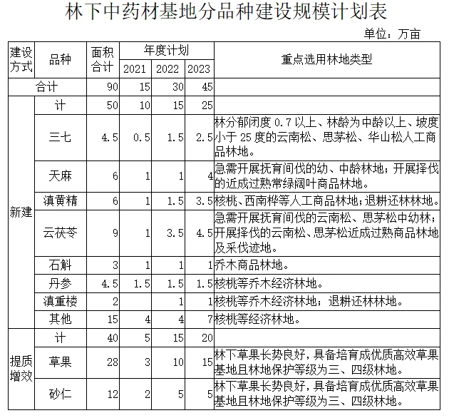 2021—2023年,林下中药材基地建设总规模90万亩。其中:新建50万亩,提质增效40万亩。