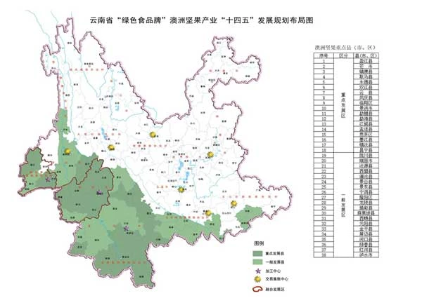 2.加工布局:根据澳洲坚果产业加工现状,以做强做优做大加工企业为目标,以“一县一业”示范县、特色县创建为抓手,以临沧市、德宏州、普洱市、西双版纳州为主,全面提升澳洲坚果初加工工艺,推进澳洲坚果初加工机械一体化进程,推动加工设备升级,力争建成4个标准化、规模化、自动化的加工技术集成基地,打造产业集群,机械化率达80%以上,并引导和促进副产物的产地资源化利用。