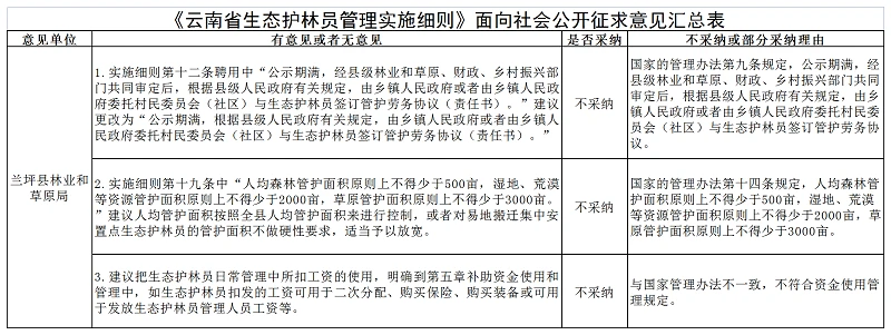为加强和规范生态护林员管理,做好巩固拓展脱贫攻坚成果同乡村振兴有效衔接工作,根据相关法律、法规和生态护林员管理制度规定,澳门威尼斯人博彩起草了《云南省生态护林员管理实施细则(征求意见稿)》,于2022年2月23日至3月10日向社会公开征求意见建议。公示期满共收到3条意见建议,经认真研究,采纳意见0条,不采纳3条,并对不采纳的原因作了说明。