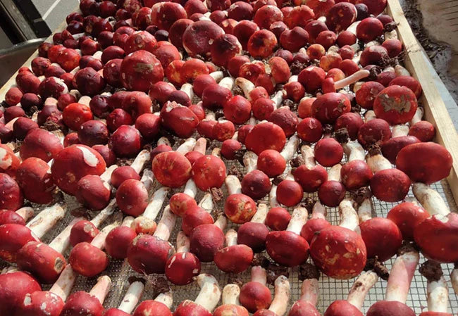 李永兰介绍,为了便于野生大红菌等这一类菌的长途运输、长期保存,她们会先清洗后通过烤箱烤干后再发货。每到雨季,野生菌一上市,她和丈夫、儿子三个人白天就到周边收购野生菌,晚上回到家中,对当天收购回来不同种类的野生菌进行分类、打包、发货。