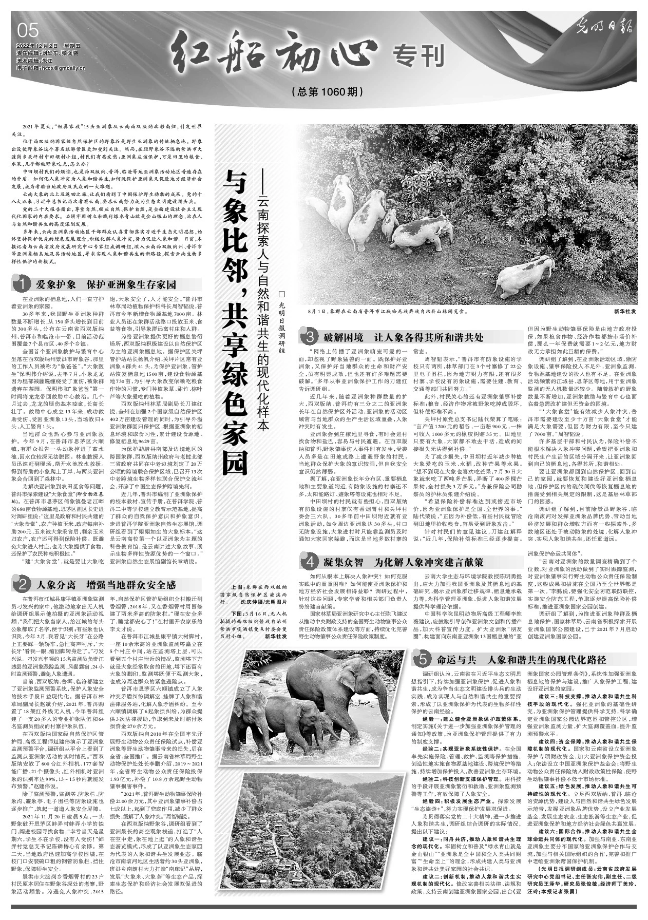 多年来,云南亚洲象活动地区干部群众认真贯彻落实习近平生态文明思想,始终坚持保护优先的绿色发展理念,积极化解人象冲突,努力促进人象和谐。日前,本报记者与云南省政府发展研究中心专家组成调研组,深入云南西双版纳州、普洱市等亚洲象栖息地及其活动地区,寻求实现人象和谐共生的新路径,探索云南生物多样性保护的新模式。
