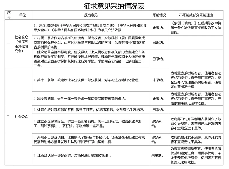 为加强古茶树保护管理,合理利用古茶树资源,澳门威尼斯人博彩起草了《云南省古茶树保护条例(草案)》(征求意见稿)(以下简称《条例(草案)》),于2022年3月22日至4月22日面向社会各界公开征求意见。公示期满,共收到反馈意见9条,经认真研究,采纳意见3条,部分采纳2条,不采纳4条,并对部分采纳和不采纳的原因作了说明。在对《条例(草案)》进行修改完善后,已报送省人民政府进入下一步立法程序。