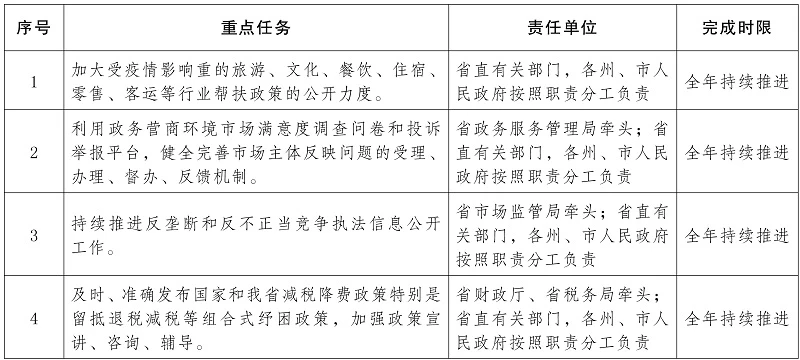 (一)加强涉及市场主体的信息公开。增强政策制定实施的透明度和可预期性,推动已出台政策尽快落实到位,提振市场主体信心。加大受疫情影响重的旅游、文化、餐饮、住宿、零售、客运等行业帮扶政策的公开力度,促进稳就业和消费恢复。利用政务营商环境市场满意度调查问卷和投诉举报平台,健全完善市场主体反映问题的受理、办理、督办、反馈机制,助力优化营商环境。持续推进反垄断和反不正当竞争执法信息公开工作,为各类市场主体规范健康发展营造诚信守法、公平竞争的市场环境。(省直有关部门,各州、市人民政府按照职责分工负责)