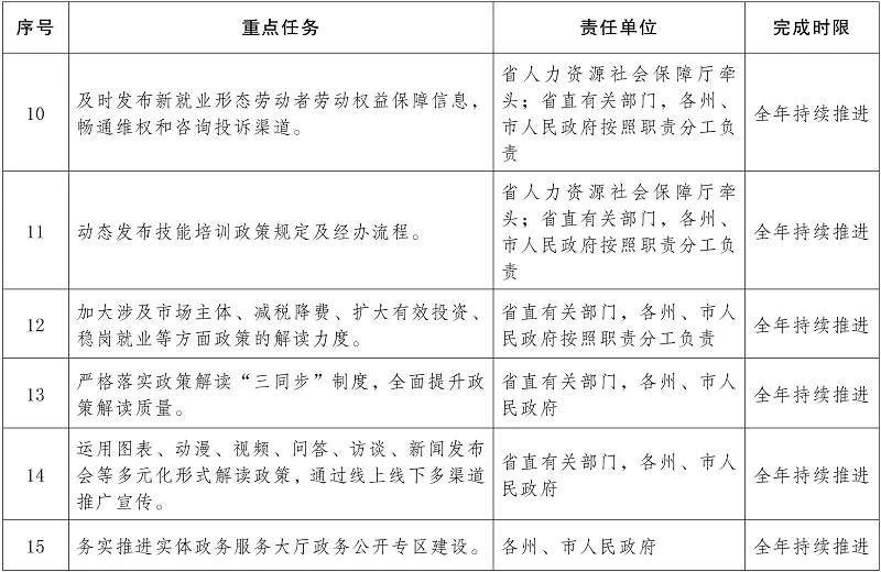 (二)突出做好稳就业保就业信息公开。着力支持市场主体稳岗,加大失业保险稳岗返还、留工补助、留工培训等政策发布解读和政策培训工作力度,重点对基层执行机关开展政策培训,使有关政策能够落得快、落得准、落得实。深入推进面向高校毕业生、退役军人、失业人员等重点群体的就业服务信息和促进就业创业政策措施公开。及时发布新就业形态劳动者劳动权益保障信息,畅通维权和咨询投诉渠道。动态发布技能培训政策规定及经办流程,让更多群众能够知悉,并获得就业培训机会。(省人力资源社会保障厅、省教育厅、省退役军人厅牵头;省直有关部门,各州、市人民政府按照职责分工负责)