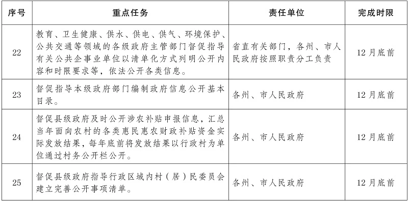 (四)健全完善政务公开目录体系。教育、卫生健康、供水、供电、供气、环境保护、公共交通等领域的各级政府主管部门要切实履行职责,按照国务院主管部门出台的有关公共企事业单位信息公开规定,督促指导有关公共企事业单位以清单化方式列明公开内容和时限要求等,依法公开各类信息。各州、市人民政府要督促指导本级政府部门编制政府信息公开基本目录。县级及以下政府要严格落实《云南省人民政府办公厅关于全面推进基层政务公开标准化规范化工作的实施意见》(云政办发〔2020〕33号)要求,建立健全政府信息管理、依申请公开、解读回应、公众参与、监督考核等工作制度,根据国家部门新印发的有关领域基层政务公开标准指引,及时编制发布本级政务公开事项标准目录。县级政府要及时公开涉农补贴申报信息,汇总当年面向农村的各类惠民惠农财政补贴资金实际发放结果,每年底前将发放结果以行政村为单位通过村务公开栏公开,同时指导村(居)民委员会建立完善公开事项清单,全面完成行政区域内村(居)务公开目录体系建设。(省直有关部门,各州、市人民政府按照职责分工负责)