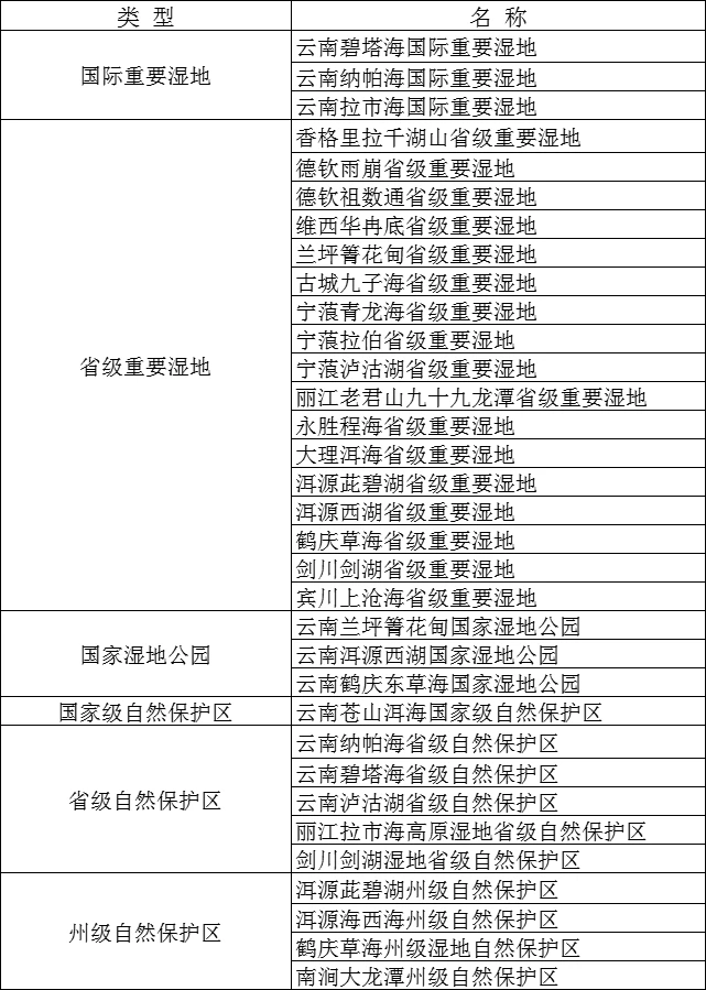 表3-1 滇西、滇西北湿地单元重要湿地/湿地类型保护地名录