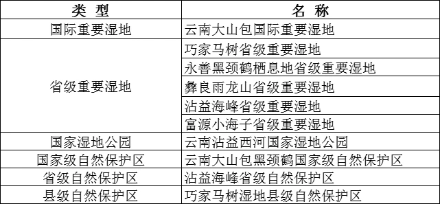 表3-2 滇东北湿地单元重要湿地/湿地类型保护地名录