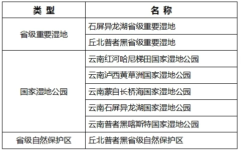 表3-4 滇东南湿地单元重要湿地/湿地类型保护地名录