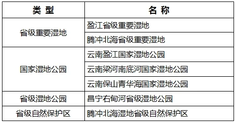 表3-6 滇西南湿地单元重要湿地/湿地类型保护地名录