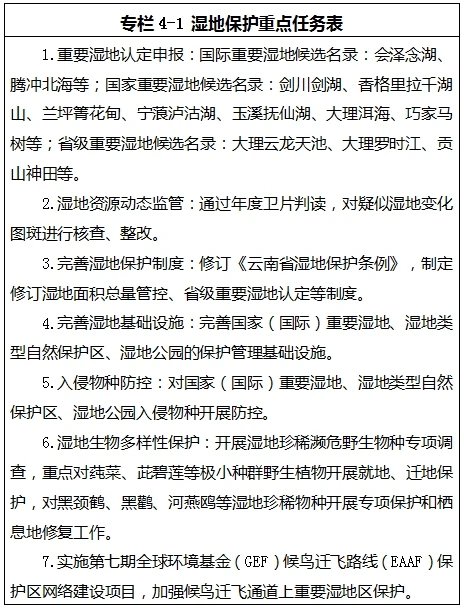 《规划》提出了我省湿地保护的指导思想、发展目标和工作重点。贯彻落实《中华人民共和国湿地保护法》,提升我省依法治湿能力,进一步强化湿地资源监管,完善湿地分级管理体系,创新开展湿地宣传教育,推进湿地监测,提高湿地信息化与智能化管理水平,促进湿地保护与合理利用。结合全省湿地分布区域特点,《规划》以重要湿地、湿地类型自然保护区和湿地公园等湿地资源分布重要区域为重点,规划实施一批湿地保护与恢复项目,发挥示范带动作用,推动云南湿地保护工作再上新台阶、取得新成效。