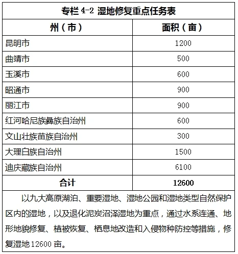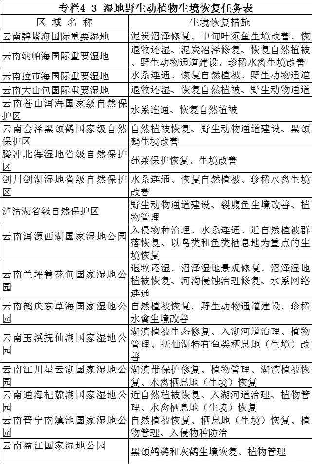 在调查、监测和评估的基础上,对被破坏的野生动物重要栖息地和水鸟迁徙停歇地、珍稀植物原生地等生态敏感区域,恢复野生动植物生境,构建健康完善的食物链和食物网,恢复湿地生物多样性。重点对大山包、拉市海、碧塔海、纳帕海、念湖、剑湖、盈江等珍稀濒危物种集中分布地和云南省极小种群野生植物分布区,采取封禁保护、人工辅助自然恢复、生境改善等措施,加强野生动植物生境恢复。