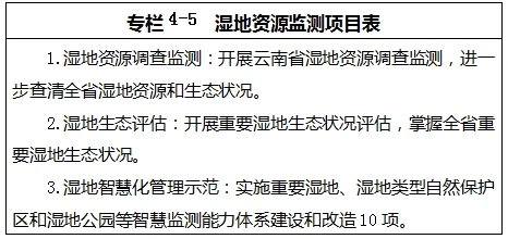 按照全国森林、草原、湿地调查监测工作要求,构建湿地动态监测体系,满足国家和云南省对湿地资源及生态状况监测的需要。优先依托重要湿地和湿地类型的自然保护区,推进全省湿地生态监测体系建设。加强湿地生态监测站点建设与管理,健全完善湿地生态监测指标体系,加强湿地监测人才培养,采用先进技术和方法提高监测技术水平、监测数据质量和信息化水平。