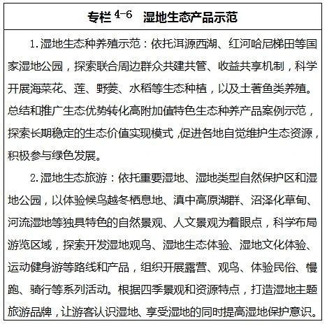 在有效保护湿地资源的前提下,依托具备条件的湿地公园和湿地类型自然保护区独特的自然禀赋,采取自繁自养等原生态种养模式,提高生态产品价值;依托优美自然风光、历史文化遗存,在最大限度减少人为扰动前提下,打造旅游与康养休闲融合发展的生态旅游产品示范。通过新闻媒体、互联网和自媒体等多种渠道,加大生态产品宣传推介力度,提升生态产品的社会关注度。鼓励地方因地制宜开展小微湿地建设和修复,丰富不同湿地的合理利用示范模式。