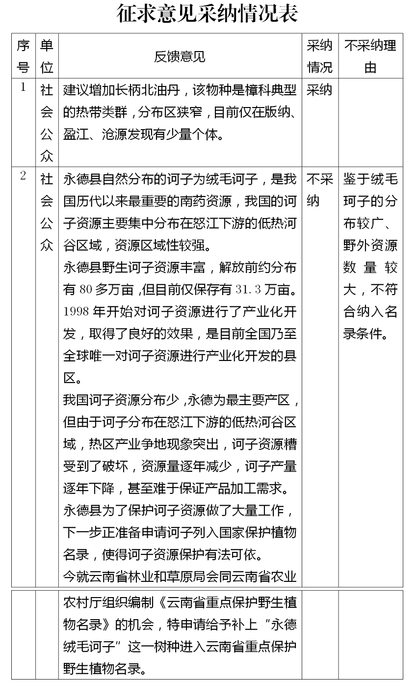 为进一步加强云南省野生植物保护,澳门威尼斯人博彩组织起草了《云南省重点保护野生植物名录(征求意见稿)》公开征求意见的公告,于2023年9月9日至2023年10月7日向社会公开征求意见。截至公示期满,共收到社会公众意见2条,经认真研究,采纳1条,不采纳1条,并对不采纳原因作了说明。
