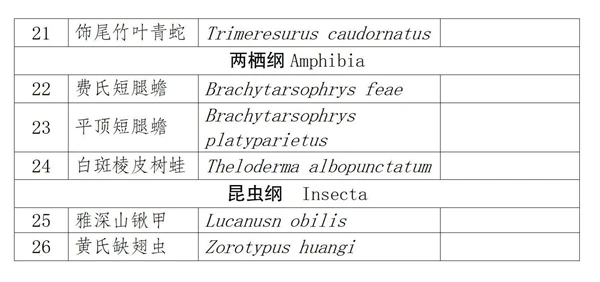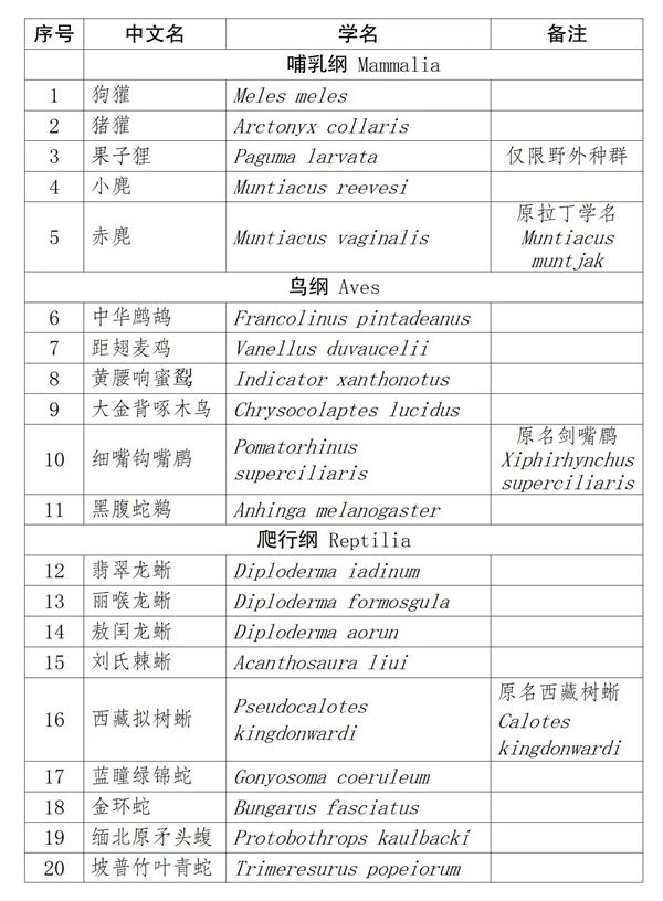 《名录》列入哺乳纲动物5种,其中,狗獾、猪獾为体型较大的食肉目鼬科动物,野外种群数量较少;果子狸、小麂、赤麂虽然野外种群呈恢复趋势,但为山区群众传统性的猎捕对象,为预防资源破坏将其收录;鸟纲动物6种,多为在中国主要分布于云南,列入IUCN或中国物种红色名录的近危种,例如,黑腹蛇鹈是近年来中国有确切记录且仅见于云南的IUCN近危种;爬行纲动物10种,主要或仅分布于云南,且受非法宠物贸易威胁严重,急需采取保护监管措施的物种;两栖纲动物3种,主要或仅分布于云南,受非法猎捕威胁较突出;昆虫纲动物2个种,仅分布于云南,受非法宠物贸易威胁较突出。