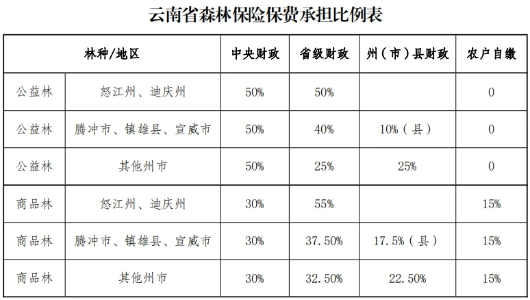 3.云南省森林保险保费由各级财政承担的补贴比例,以及农户自缴保费的比例,具体见下表: