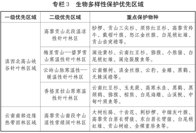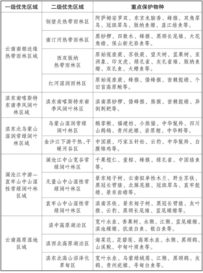 6条生态廊道。保障重要生态功能区域的联通性,其中,怒江生物多样性保护廊道,联通青藏高原东南缘生态屏障与南部边境生态屏障;迪庆—丽江生物多样性保护廊道,联通老君山至云岭山脉一带;元江生物多样性保护廊道,联通永德大雪山、新平哀牢山、绿春黄连山一带;普洱—西双版纳生物多样性保护廊道,沿澜沧江联通普洱至西双版纳生物走廊;滇东南水土保持廊道,联通滇东滇东南石漠化带、南部边境生态屏障以及广南八宝自然保护区;滇东北—滇中水土保持廊道,联通昭通乌蒙山、金沙江干热河谷地带、东南部喀斯特地带、寻甸黑颈鹤自然保护区及滇中高原湖泊群。