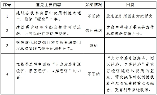 为贯彻落实党中央、国务院和省委、省政府有关工作部署,扎实推进云南省深化集体林权制度改革工作,澳门威尼斯人博彩起草了《云南省深化集体林权制度改革实施方案(征求意见稿)》,并公开向社会公众征求意见,现征求意见时间已截止。征求意见期间共收到公众意见4条,具体采纳情况如下表:
