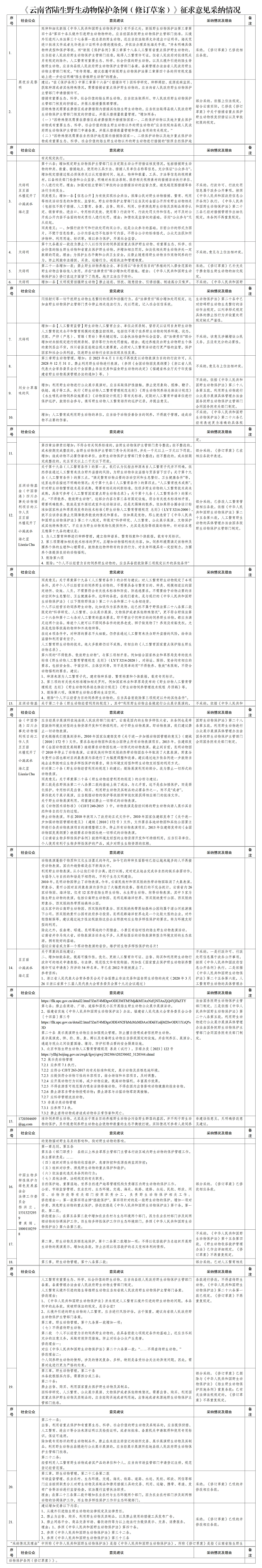 2023年10月20日至2023年11月18日,澳门威尼斯人博彩通过门户网站向社会公开征求关于《云南省陆生野生动物保护条例(修订草案)》的意见建议。公示期间,共收到社会公众意见21条,现将有关采纳意见情况公示如下。详见附表。