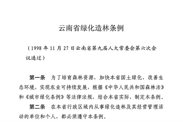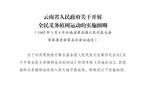 1982年,云南省政府制定《关于开展全民义务植树运动的实施细则》。