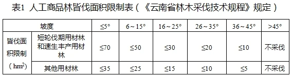 分亚林种适当放宽人工商品林皆伐面积限制,详见表1人工商品林皆伐面积限制表(《云南省林木采伐技术规程》规定)。