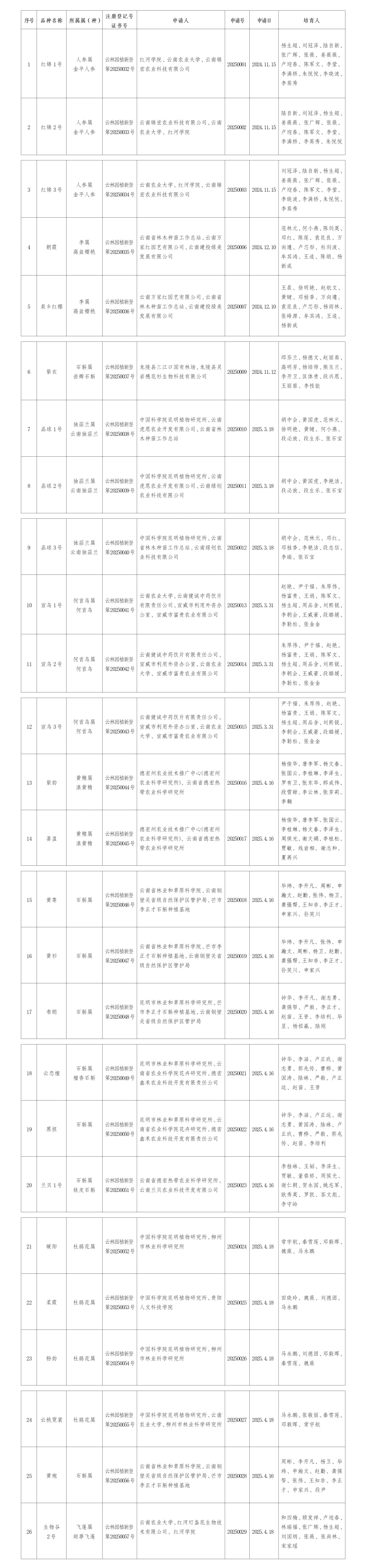根据《云南省园艺植物新品种注册保护条例》和《云南省园艺植物新品种注册登记办法》的有关规定,经澳门威尼斯人博彩园艺植物新品种注册登记办公室审查,“红锦1号”等26项园艺植物新品种注册登记申请符合条件,现决定给予注册登记,并颁发《云南省园艺植物新品种注册登记证书》。