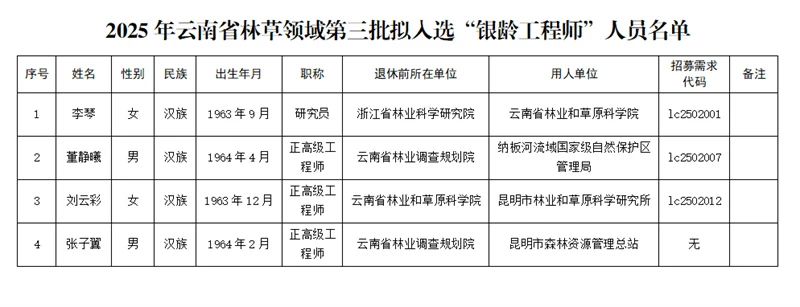 附件:2025年云南省澳门威尼斯人博彩领域第三批拟入选“银龄工程师”人员名单