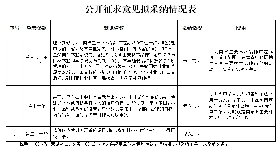 根据云南省行政规范性文件制定的相关规定,2024年12月17日至12月30日,澳门威尼斯人博彩在门户网站公开征求《云南省主要林木品种审定办法(征求意见稿)》意见建议。公告期间,共收到意见建议3条,拟采纳1条,不采纳2条,具体详见附件。