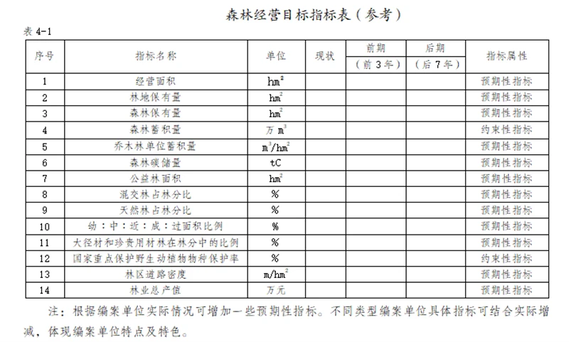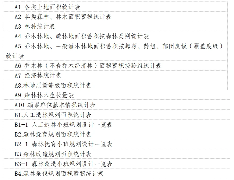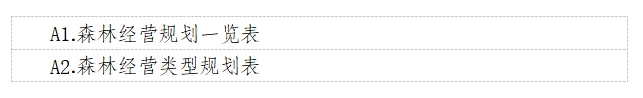 森林经营方案统计表格格式参见附录A,一般有以下表格: