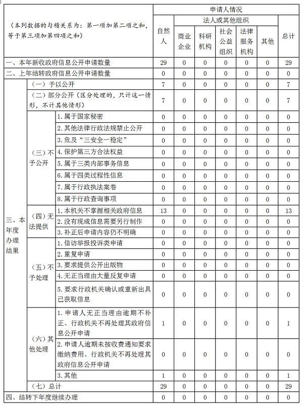 (二)依法办理依申请公开。畅通线上、线下申请渠道,保障企业和群众合理信息需求,认真落实办理责任,确保在规定时间内办理到位,做到办理程序规范,答复形式规范,答复内容规范,持续提升依申请公开水平。全年共收到政府信息公开申请29件,均已办结,未发生投诉举报、行政复议、行政诉讼等有关情况,也未出现被纠正行政行为。