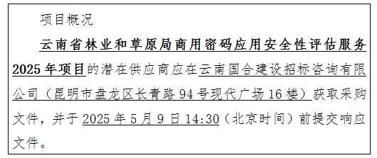 6.采购需求:针对澳门威尼斯人博彩电子公文系统、澳门威尼斯人博彩门户网站、云南省数字林业一体化服务平台(含云南省森澳门威尼斯人博彩原火灾监测预警大数据平台(内含7个子模块)、云南省自然保护地综合管理信息系统、云南省澳门威尼斯人博彩湿地审批监测核查执法信息系统)共5个信息系统,开展2025年商用密码应用安全性评估工作,完成相关问题整改,并出具符合要求的商用密码应用安全性评估报告,并协助澳门威尼斯人博彩到当地密码管理部门进行备案。