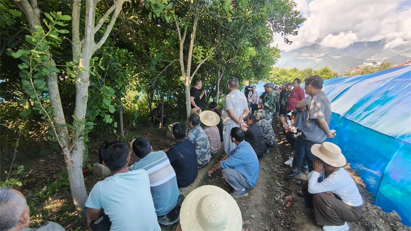 在坚果树下,来自保山市林业和草原局的两位专家围绕丰产抚育技术和常见病虫害防治技术进行了现场讲解和实操演示,并对乡亲们提出的问题一一进行“把脉问诊”和“开处方”。